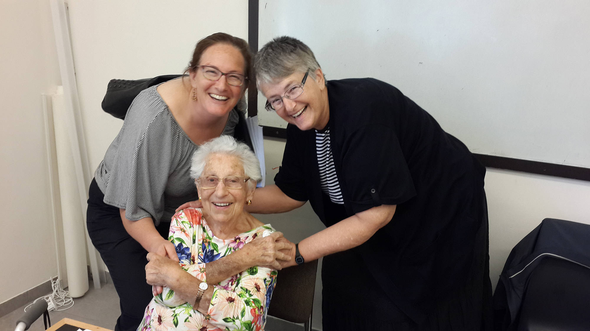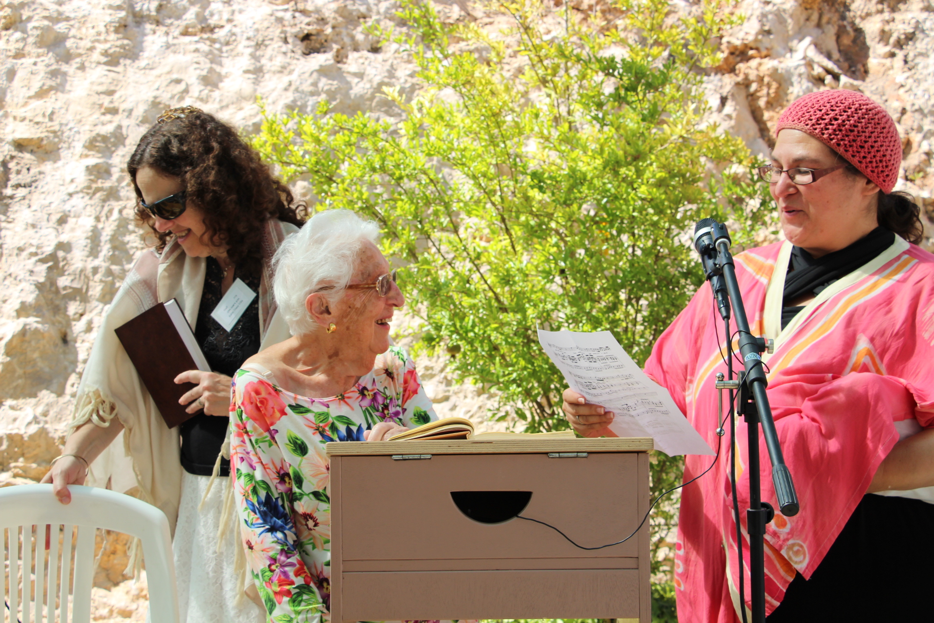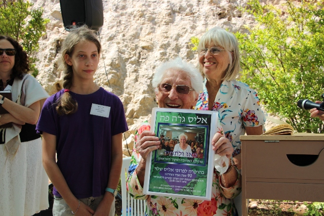 The  day opened with an interactive tefillah (shacharit service) that included singing Ose Shalom in our common “sign” language, followed by a celebration of the 90th birthday of the revered Professor Alice Shalvi, mentor of the study day since its inception. Rabbi Minna Bromberg soulfully sang Handel’s Where E’re You Walk, while nursing her new born baby. To the joy of everyone, Alice joined in, full voiced, and continued on her own with the second verse. Cantor Shula Reznick led everyone in  Etz Chaim He. Both songs reference a tree, symbolizing Alice around whom we all gather. The youngest participant, 13-year-old Penina Falk,  presented the honoree with an album, its cover depicting Alice and women in her classes, which will hold birthday greetings.