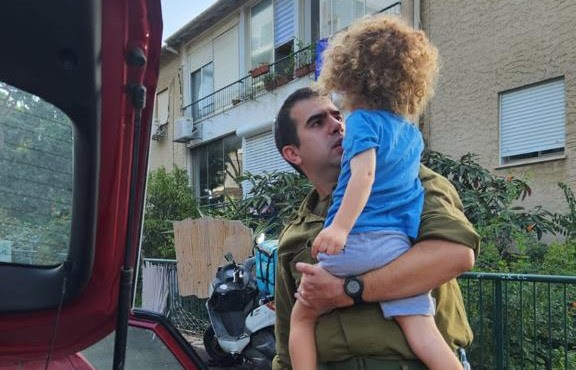 Rabbi David Arias, of Kehillat Moriah in Haifa, saying goodbye to his son as he heads off to war.