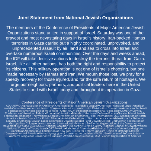 “The members of the Conference of Presidents of Major American Jewish Organizations stand united in support of Israel. Saturday was one of the gravest and most devastating days in Israel’s history. Iran-backed Hamas terrorists in Gaza carried out a highly coordinated, unprovoked, and unprecedented assault by air, land, and sea to cross into Israel and overtake numerous Israeli communities. Over the days and weeks ahead, the IDF will take decisive actions to destroy the terrorist threat from Gaza. Israel, like all other nations, has both the right and responsibility to protect its citizens. This military operation is not one of Israel’s choosing but one made necessary by Hamas and Iran. We mourn those lost, pray for a speedy recovery for those injured, and for the safe return of hostages. We urge our neighbors, partners, and political leaders here in the United States to stand with Israel today and throughout its operation in Gaza.”