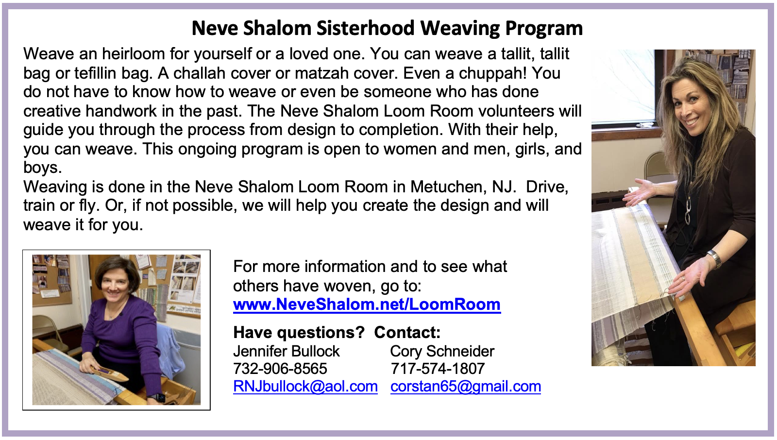 I am so pleased that Women’s League has now become a partner with our program. Each time someone comes to weave as a referral from Women’s League, we have the opportunity to share this incredible experience with them (and Women’s League also receives a referral fee). Whether you come to weave yourself or have our volunteers weave the item after you have designed it, you will take enormous pride and joy and satisfaction in your performance of hiddur mitzvah. It will be a seminal moment in your life.