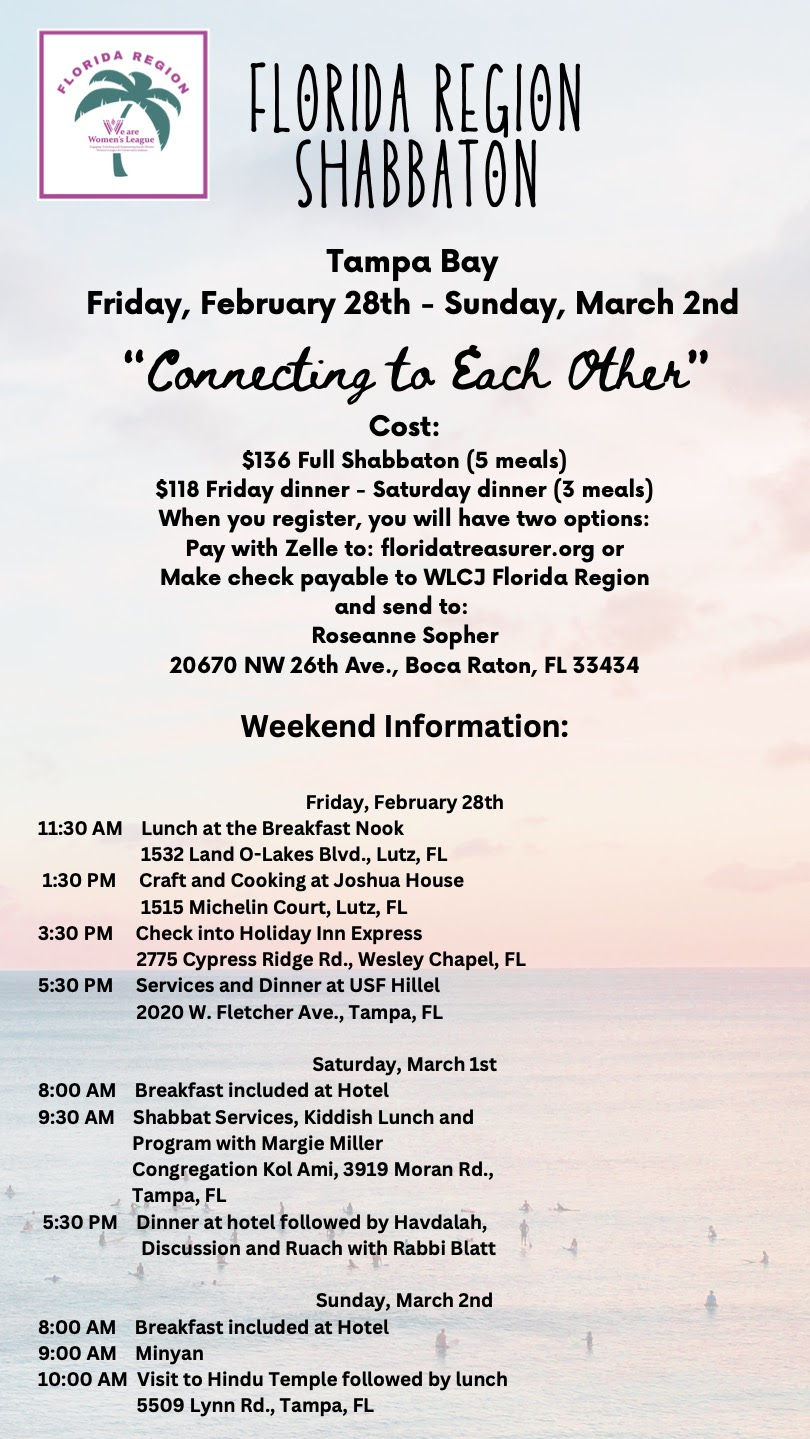 RSVP deadline for the Shabbaton is February 10. The hotel must be booked by January 31 to receive the special rate of $179 per night.