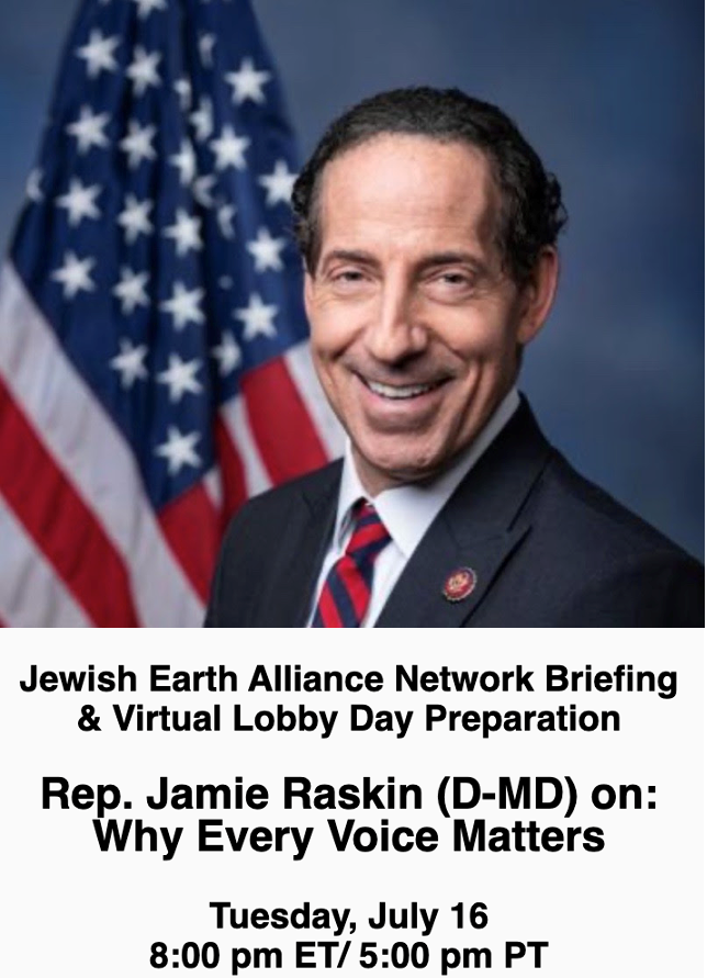 Some people hold back from lobbying Congress because they don’t believe their voice will be heard. Jamie Raskin begs to differ! On July 16th, hear him make the case that Congress needs to hear from everyday, ordinary U.S. citizens — just like the folks who take action with the Jewish Earth Alliance and its partners.In the spirit of citizen advocacy, the briefing will prepare you for the Pre-Tisha B’Av Virtual Lobby Day taking place on August 8th. Lobby leaders will organize each state in breakout sessions to plan your lobby meetings.